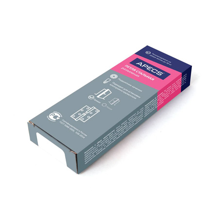 Разъемные врезные петли Apecs - одно из самых качественных предложений на рынке стальных петель. Предназначены для деревянных межкомнатных дверей.  Петли Apecs прошли испытания в России и сертифицированы согласно ГОСТ 5088-2005. Укомплектованы подшипниками качения, обеспечивающими плавность хода и долгий ресурс службы. Закаленные саморезы позволяют использовать электроинструмент при установке.  Рекомендации по установке петель в зависимости от веса дверного полотна: - максимальный вес двери на 2 петли: 100*70-B - 40 кг, 120*80-B - 50 кг; - максимальный вес двери на 3 петли: 100*70-B - 50 кг, 120*80-B - 70 кг.