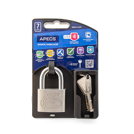 Apecs PDS XS - навесной замок с высокой степенью защиты. Комбинация корпуса из нержавеющей стали, дужки из марганцевистой стали и механизма двойной фиксации обеспечивает высокую сопротивляемость к вытягиванию дужки. Благодаря высокому качеству замки серии XS успешно прошли испытания на взломостойкость, силовое вскрытие и  работоспособность в различных температурных и погодных условиях. По результатам испытаний замки прошли сертификацию в России и получили 4 (высший) класс безопасности согласно ГОСТ 5089-2011.