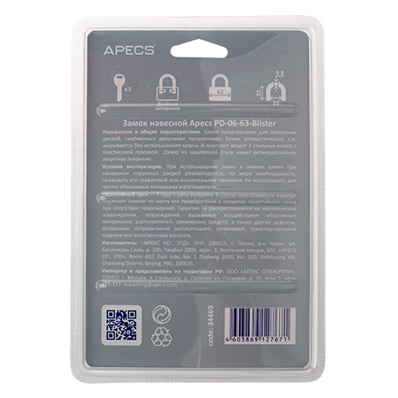 Замок навесной Apecs PD-06-63-Blister
