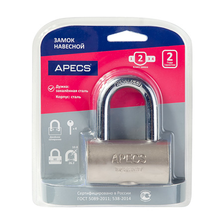 Навесные замки из стали с повышенной степенью защиты. Фиксация дужки с двух сторон обеспечивает надежное запирание замка и защиту от сворачивания. Замки имеют закаленную дужку, обеспечивающую защиту от перепиливания и перекусывания. В замках PDS-65 реализована функция автоматического запирания:  запирание замка осуществляется нажатием на дужку без использования ключа.