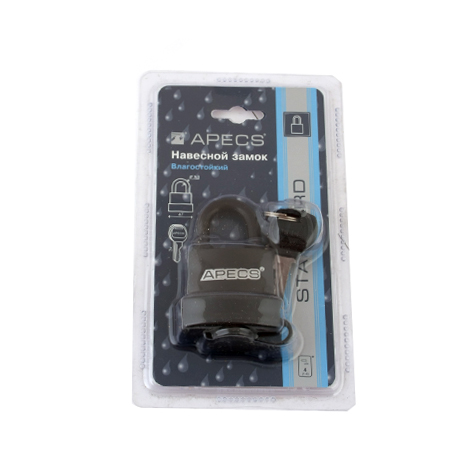 Всепогодные навесные замки Apecs серии 50 - высококачественные навесные замки из чугуна в пластиковом чехле, превосходящие по качеству большинство аналогов на рынке. Пластиковый чехол выполнен из морозоустойчивого материала, не подверженного растрескиванию при температуре до (-40) градусов. Заглушка на цилиндр из мягкой резины превосходит аналоги с пластиковой заглушкой по сроку службы.  В замках используется полноразмерный латунный цилиндровый механизм и пружины из  нержавеющей стали. Фиксация дужки с двух сторон обеспечивает надежное запирание замка. В замках реализована функция автоматического запирания:  запирание замка осуществляется нажатием на дужку без использования ключа.