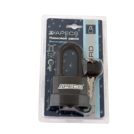 Всепогодные навесные замки Apecs серии 50 - высококачественные навесные замки из чугуна в пластиковом чехле, превосходящие по качеству большинство аналогов на рынке. Пластиковый чехол выполнен из морозоустойчивого материала, не подверженного растрескиванию при температуре до (-40) градусов. Заглушка на цилиндр из мягкой резины превосходит аналоги с пластиковой заглушкой по сроку службы.  В замках используется полноразмерный латунный цилиндровый механизм и пружины из  нержавеющей стали. Фиксация дужки с двух сторон обеспечивает надежное запирание замка. В замках реализована функция автоматического запирания:  запирание замка осуществляется нажатием на дужку без использования ключа.