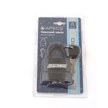 Всепогодные навесные замки Apecs серии 50 - высококачественные навесные замки из чугуна в пластиковом чехле, превосходящие по качеству большинство аналогов на рынке. Пластиковый чехол выполнен из морозоустойчивого материала, не подверженного растрескиванию при температуре до (-40) градусов. Заглушка на цилиндр из мягкой резины превосходит аналоги с пластиковой заглушкой по сроку службы.  В замках используется полноразмерный латунный цилиндровый механизм и пружины из  нержавеющей стали. Фиксация дужки с двух сторон обеспечивает надежное запирание замка. В замках реализована функция автоматического запирания:  запирание замка осуществляется нажатием на дужку без использования ключа.